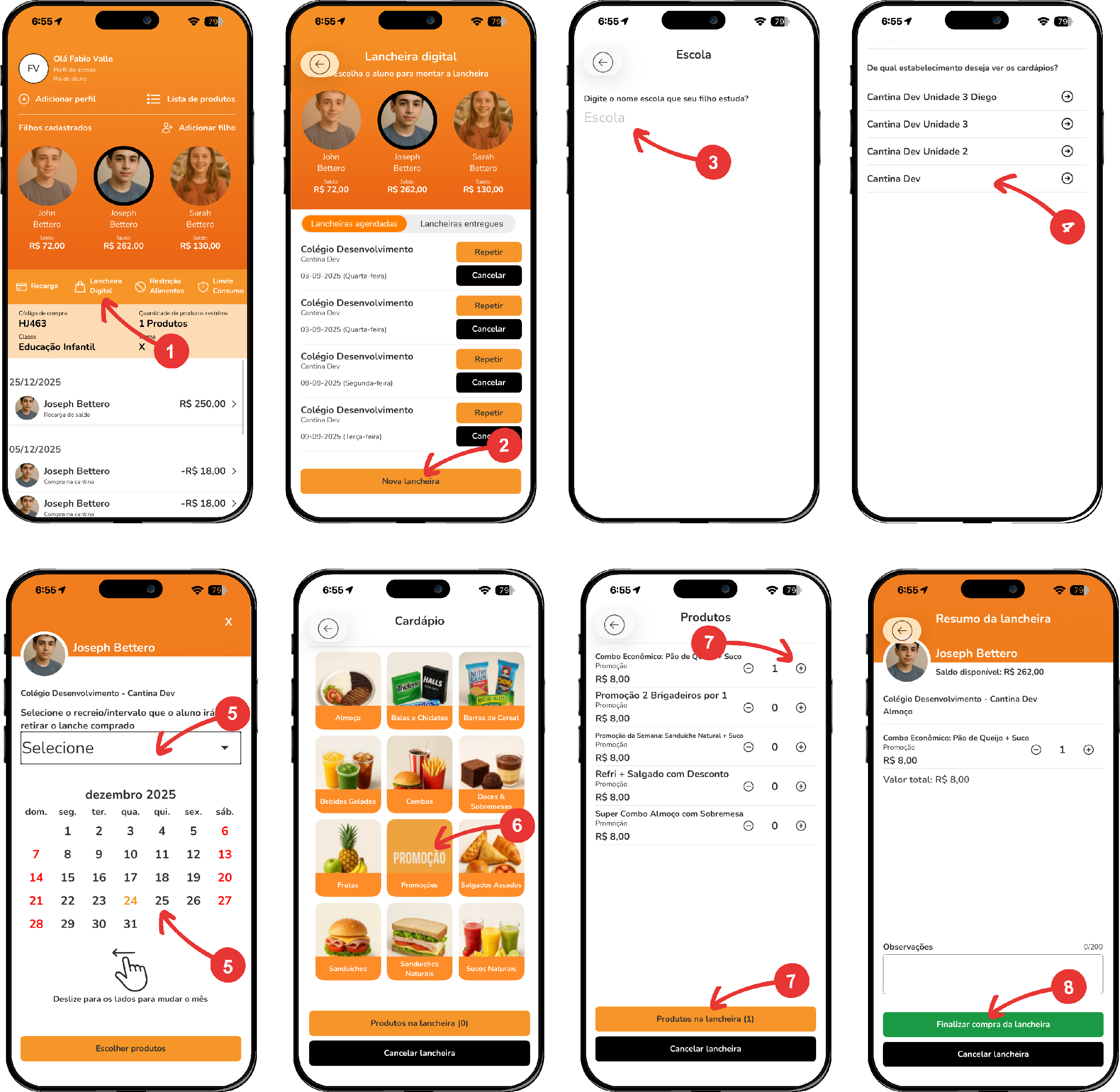 - Selecione o recreio/intervalo e a data da retirada do lanche.